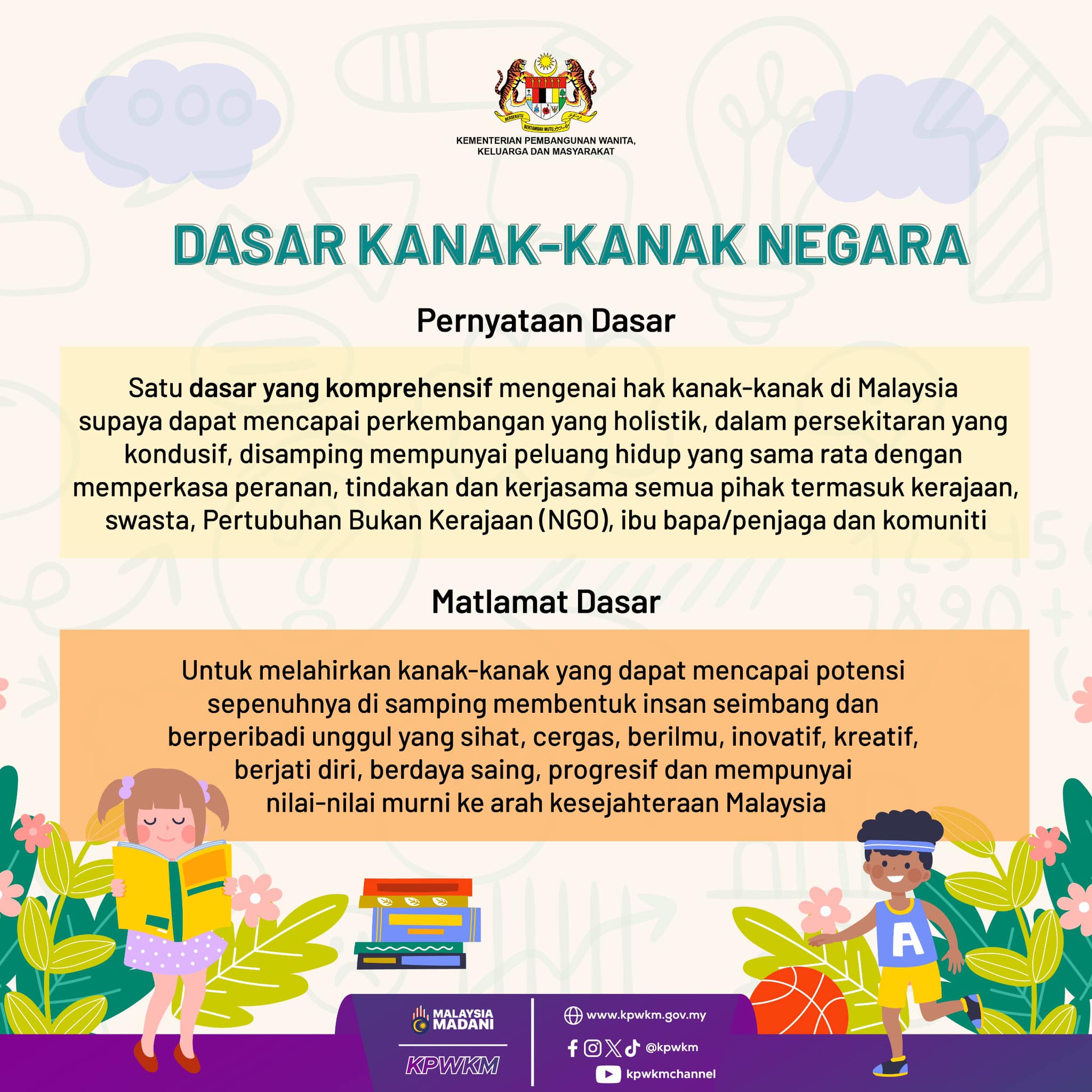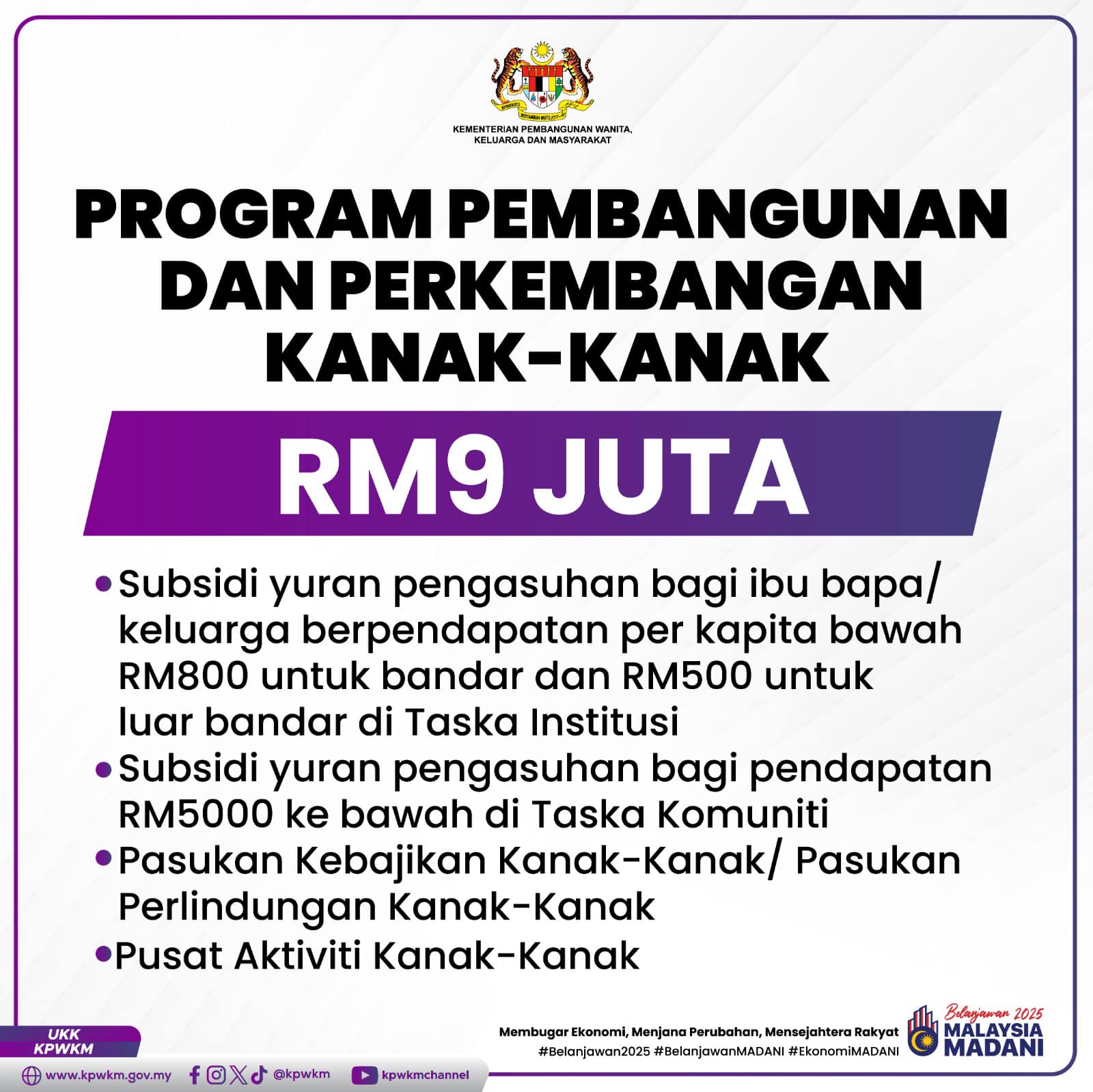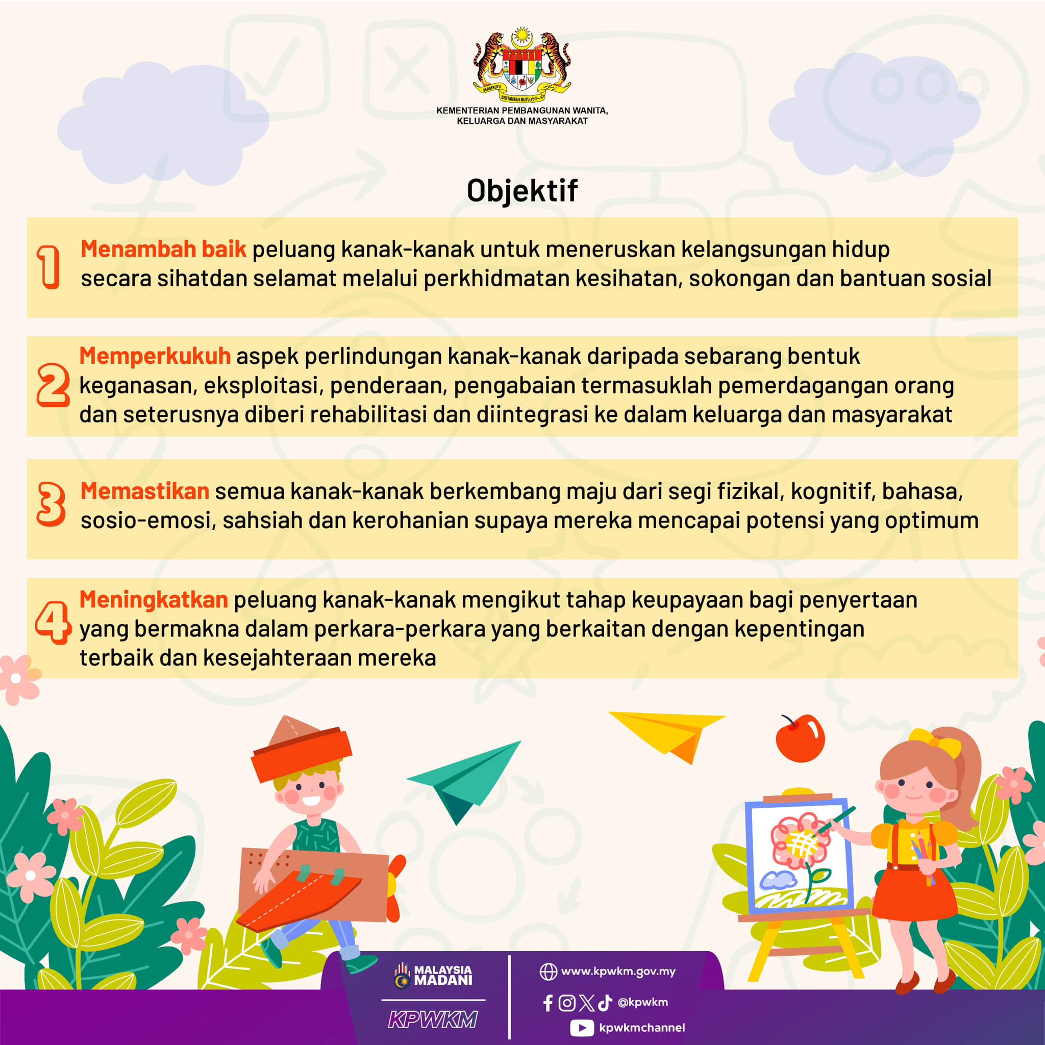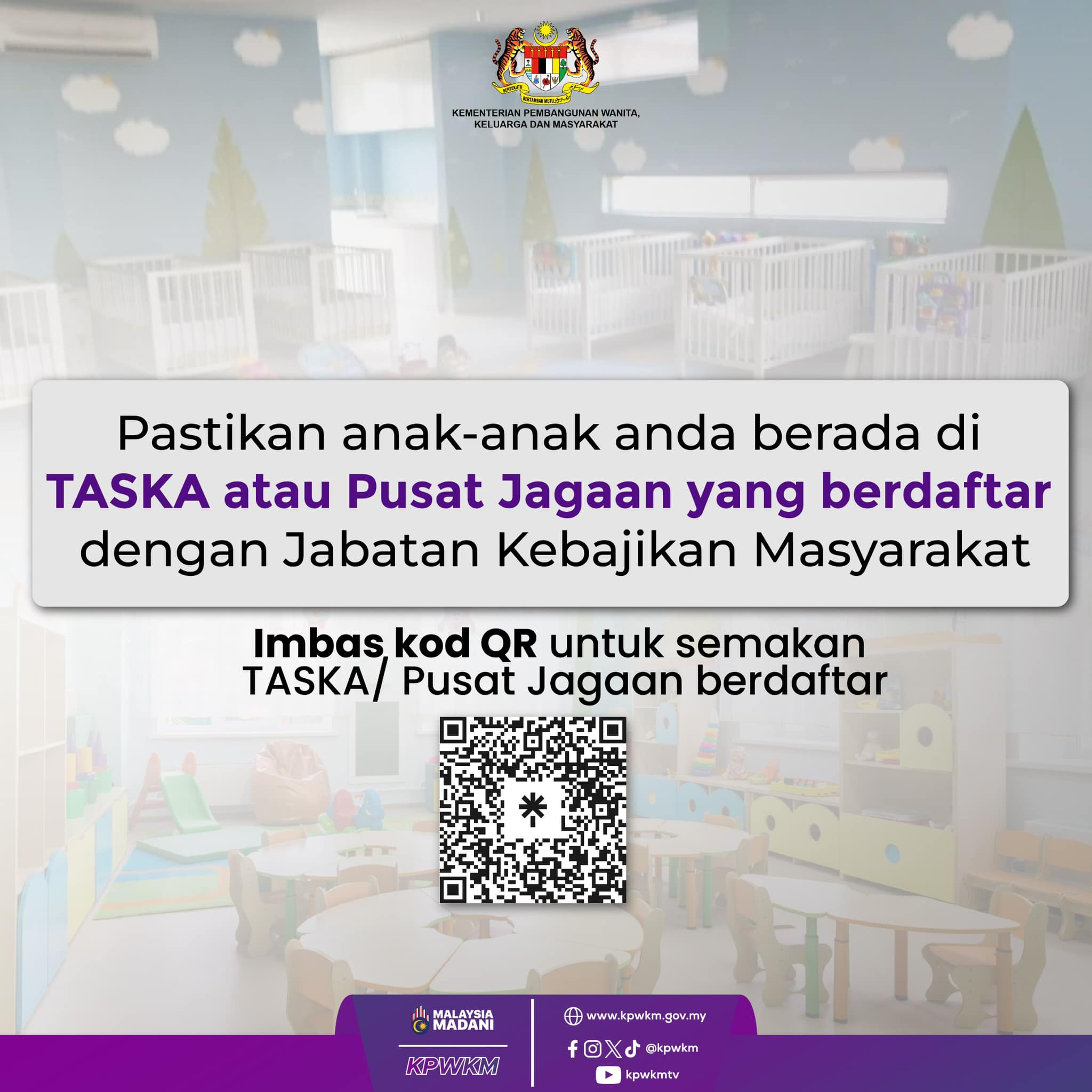 Terima kasih kerana melayari Portal Rasmi Kementerian Pembangunan Wanita, Keluarga dan Masyarakat. Portal ini dalam tempoh pengujian. Portal ini mungkin akan memaparkan maklumat yang kurang tepat sepanjang tempoh ini, sebarang pertanyaan sila emelkan kepada ukk@kpwkm.gov.my. Sekian, terima kasih.
